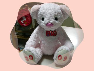 知人に女の子が誕生したので、お祝いとして作りました。足のパッドには生まれた年を、よだれかけには名前を入れました。