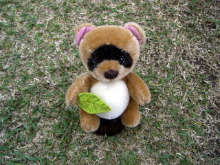 たぬきというと化けるというイメージがうかんできて(考えが古い?)葉っぱを持たせてみました。だから、通称イカサマたぬきです。まだまだ修行中の身で牧場の仲間にときどきするイタズラもかわいいものです。でも本当はすごく性格の良いやさしい子です。